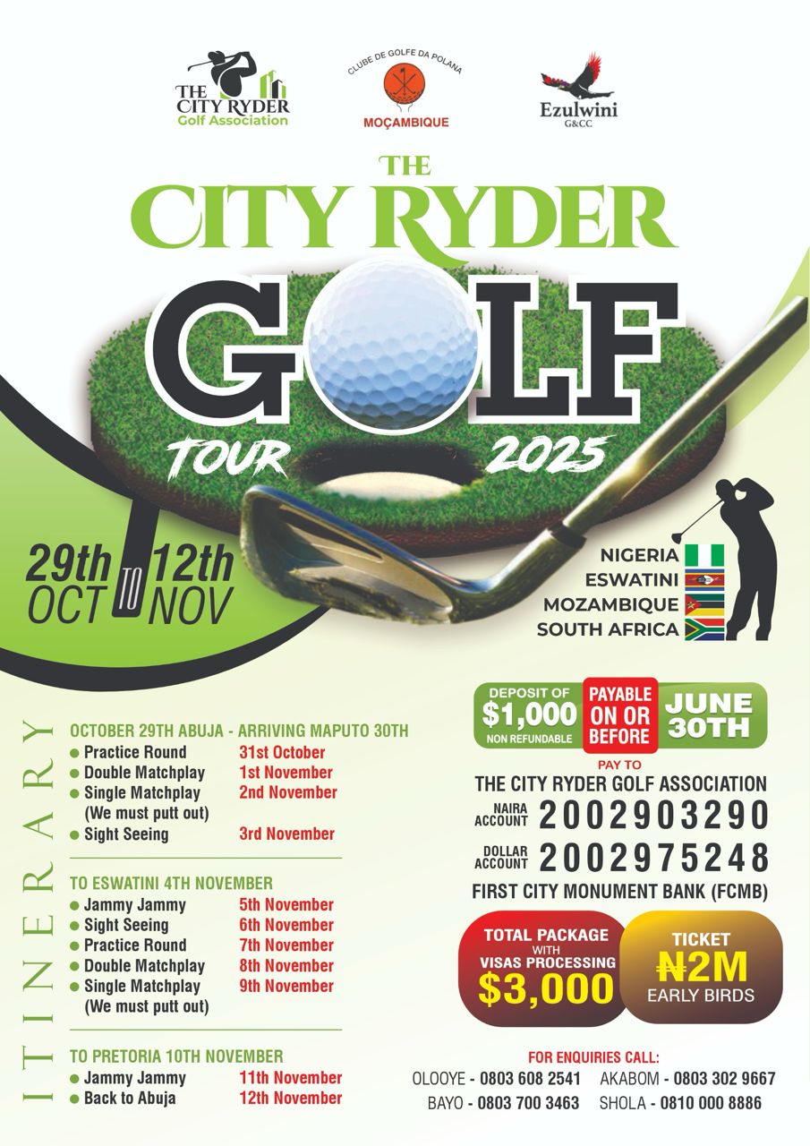Step into the ultimate golf journey with City Ryder Golf Association as we tee off from Nigeria to Eswatini, Mozambique, and South Africa this October. More than a tour, this is a carefully curated adventure for golfers who crave both challenge and discovery.